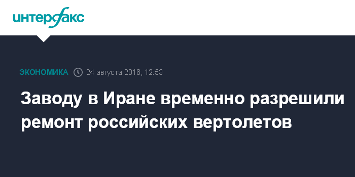 Москва. 24 августа. INTERFAX.RU - Иранский завод Iranian Helicopter Support and Renewal Company (IHSRC) получил временную авторизацию на ремонт вертолетов марки "Ми".