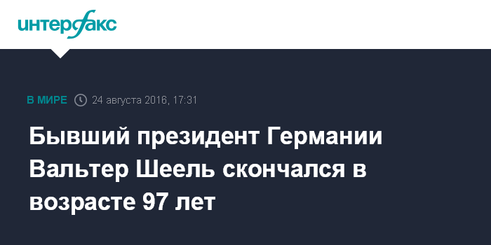 Москва. 24 августа. INTERFAX.RU - Экс-президент ФРГ Вальтер Шеель после продолжительной болезни скончался в возрасте 97 лет, сообщила в среду на своем сайте германская газета Sueddeutsche Zeitung.