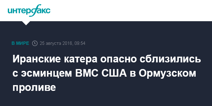 Москва. 25 августа. INTERFAX.RU - Четыре катера Корпуса стражей Исламской революции Ирана подошли на опасно близкое расстояние менее чем в 300 м к эскадренному эсминцу ВМС США "Нице" в международных водах Ормузского пролива, сообщает американский телеканал Fox News со ссылкой на представителя военно-морского командования Соединенных Штатов.