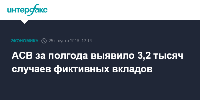Москва. 25 августа. INTERFAX.RU - Агентство по страхованию вкладов (АСВ) в первом полугодии выявило 3,2 тыс. случаев формирования фиктивных вкладов на общую сумму 2,8 млрд рублей, говорится отчете АСВ за январь-июнь 2016 года.