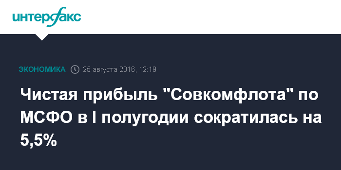 Москва. 25 августа. INTERFAX.RU - Чистая прибыль ПАО "Совкомфлот" (СКФ) по МСФО в I полугодии 2016 года сократилась на 5,5% по сравнению с тем же периодом 2015 года, до 11,742 млрд руб., следует из отчета компании.