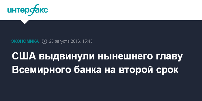 Москва. 25 августа. INTERFAX.RU - Министерство финансов США в четверг объявило о выдвижении кандидатуры нынешнего председателя Всемирного банка (ВБ) Джима Ён Кима на второй срок в качестве главы международной организации.