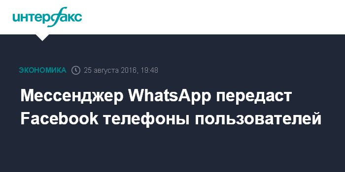 Москва. 25 августа. INTERFAX.RU - Мессенджер WhatsApp передаст телефоны пользователей соцсети Facebook, что станет первым изменением его политики конфиденциальности с момента его покупки соцсетью в 2014 году.