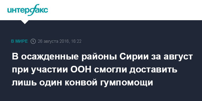 Москва. 26 августа. INTERFAX.RU - В Управлении по координации гуманитарных вопросов ООН (УКГВ) считают, что в августе условия для доставки гуманитарной помощи в осажденные районы Сирии были абсолютно неудовлетворительными, говорится в пятницу в заявлении УКГВ.