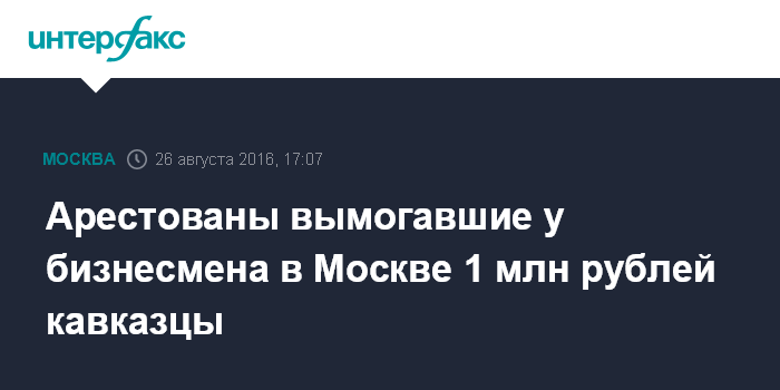 Москва. 26 августа. INTERFAX.RU - Суд арестовал на два месяца шестерых уроженцев Северного Кавказа подозреваемых в вымогательстве миллиона рублей у столичного предпринимателя, сообщила "Интерфаксу" в пятницу официальный представитель МВД России Ирина Волк.