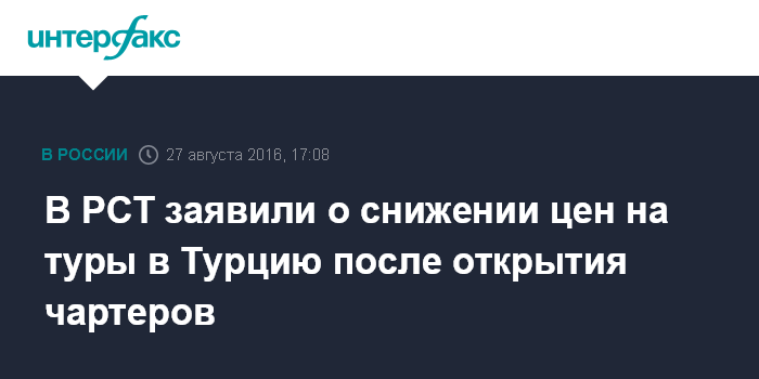 Москва. 27 августа. INTERFAX.RU - Открытие чартерного сообщения с Турцией позволит туроператорам снизить стоимость путевок в эту страну на 20-30%, сообщила в субботу порталу "Интерфакс-Туризм" пресс-секретарь Российского союза туриндустрии (РСТ) Ирина Тюрина.