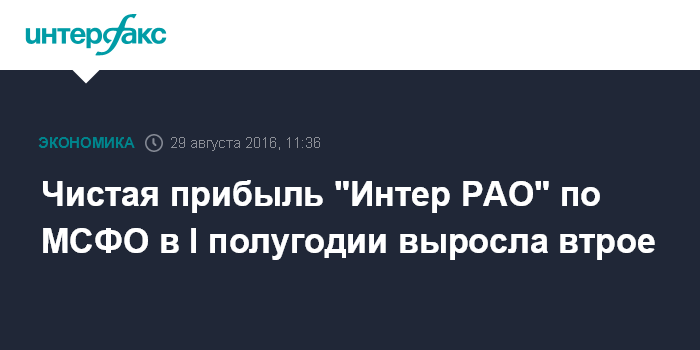 Москва. 29 августа. INTERFAX.RU - ПАО "Интер РАО" получило в январе-июне чистую прибыль по МСФО в размере 61,97 млрд рублей против прибыли в 19,7 млрд рублей годом ранее, следует из отчетности компании.