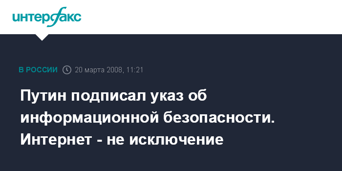 Москва. 20 марта. INTERFAX.RU - Президент РФ Владимир Путин подписал указ "О мерах по обеспечению информационной безопасности РФ при использовании информационно-телекоммуникационных сетей международного информационного обмена".