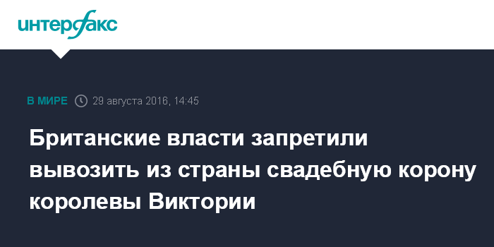 Москва. 29 августа. INTERFAX.RU - Министерство культуры Великобритании наложило временный запрет на вывоз за границу короны, в которой венчалась королева Виктория со своим мужем, принцем Альбертом, сообщает "Би-би-си". Окончательное решение будет принято в декабре.