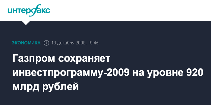 Газпром сохраняет инвестпрограмму-2009 на уровне 920 млрд рублей