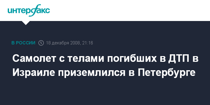 Москва. 18 декабря. INTERFAX.RU - Самолет МЧС РФ с телами 24-х погибших в ДТП в Израиле приземлился в петербургском аэропорту "Пулково", передает корреспондент "Интерфакса".