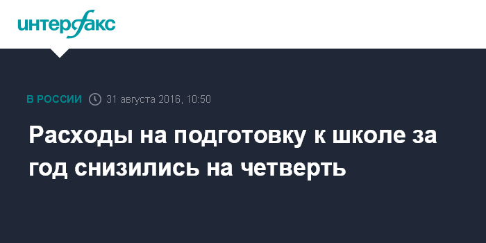Москва. 31 августа. INTERFAX.RU - Расходы российских родителей на подготовку детей к школе снизились по сравнению с прошлым годом на 26% - до 14 810 руб. против 20 026 руб. в 2015 году, сообщает ВЦИОМ.