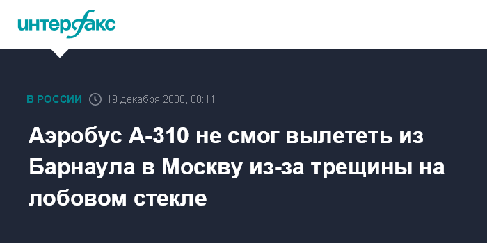 Самолет должен был вылететь из Барнаула в Москву в 7:10 в четверг, однако рейс не состоялся, сообщила агентству "Интерфакс-Сибирь" референт отдела процессуального контроля и взаимодействия со СМИ Западно-Сибирского Следственного управления на транспорте Татьяна Дубенюк. "По предварительным данным причиной невылета Airbus A-310 послужила трещина лобового стекла", сказала она, добавив, что на борту самолета находились 7 членов экипажа и 90 пассажиров.
