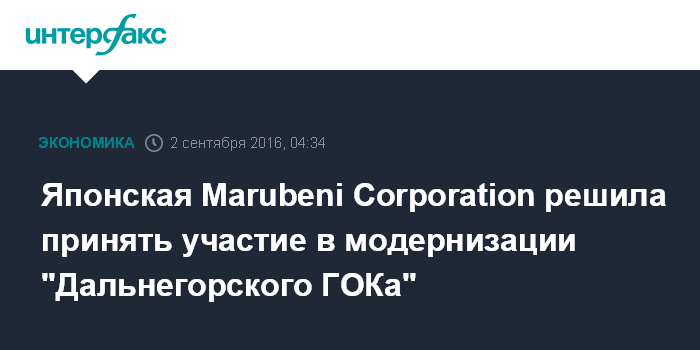Москва. 2 сентября. INTERFAX.RU - Японская Marubeni Corporation примет участие в модернизации производственных мощностей ООО "Дальнегорский ГОК" (Приморский край) под расширение экспортного потенциала предприятия.