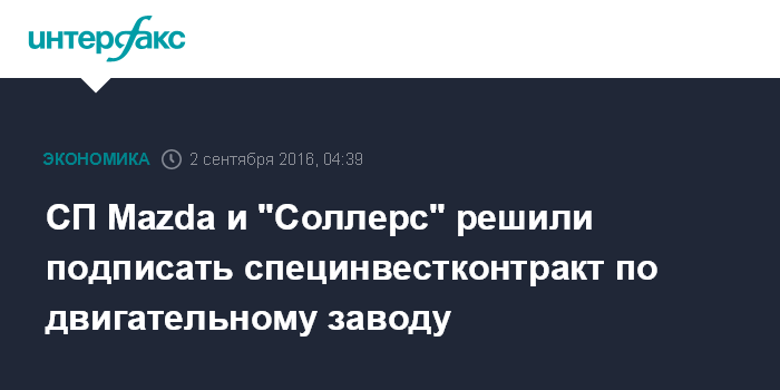 Москва. 2 сентября. INTERFAX.RU - Совместное предприятие японского автопроизводителя Mazda и российского ПАО "Соллерс" подпишет специальный инвестиционный контракт (СПИК) с Минпромторгом РФ, который подразумевает строительство двигательного завода производительностью 50 тыс. двигателей в год.