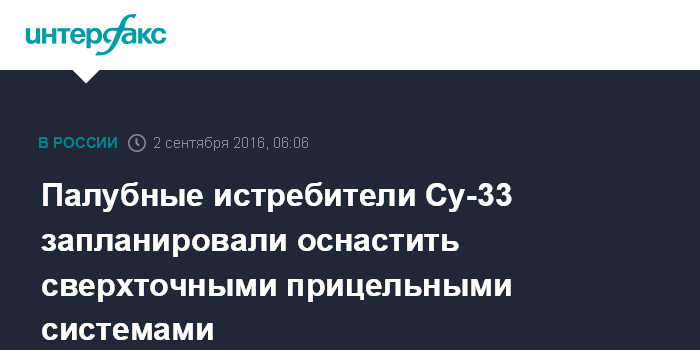 Москва. 2 сентября. INTERFAX.RU - Палубные Су-33 российского тяжелого авианесущего крейсера "Адмирал Кузнецов", уходящего осенью на боевую службу к берегам Сирии, будут оснащены спецсистемой для поражения наземных целей, а МиГ-29КР будут применять корректируемые авиабомбы, пишут "Известия" в пятницу.