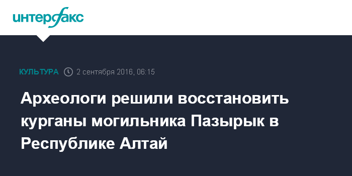 Москва. 2 сентября. INTERFAX.RU - В Республике Алтай планируют восстановить курганы Пазырыкского могильника, раскопанные в 20-е годы и пользующиеся популярностью среди туристов, сообщает пресс-центр республиканского правительства.