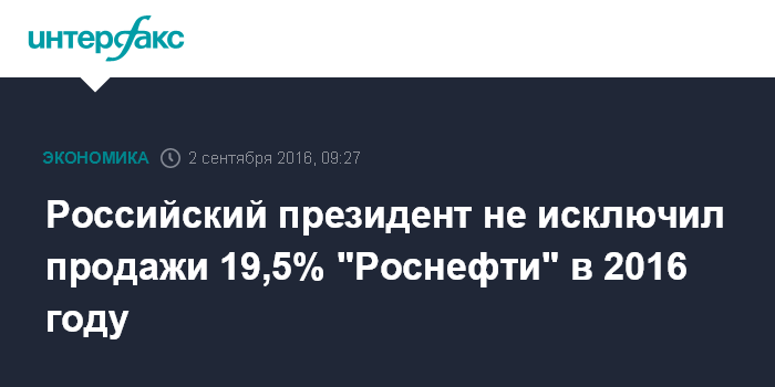 Москва. 2 сентября. INTERFAX.RU - Продажа 19,5%-ного пакета акций "Роснефти", принадлежащего госхолдингу "Роснефтегаз", может состояться в этом году, сказал в интервью Bloomberg президент РФ Владимир Путин.