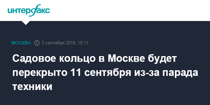 Москва. 2 сентября. INTERFAX.RU - В Москве движение на Садовом кольце будет перекрыто для автомобилистов днем 11 сентября из-за проведения парада городской техники, сообщает информационный центр транспортного комплекса столицы. Ограничения введут на четыре часа с 13:00 до 17:00.