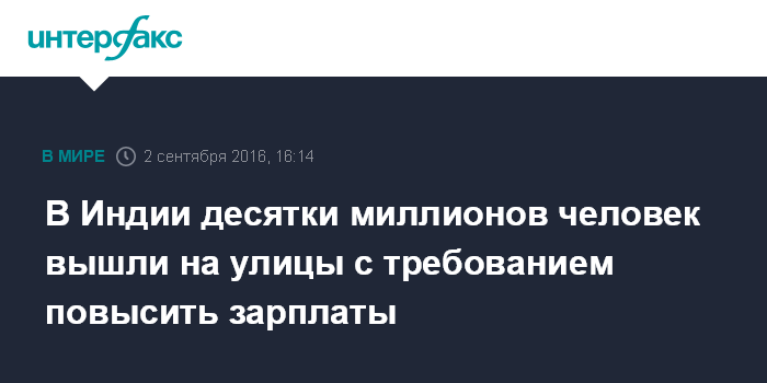 Москва. 2 сентября. INTERFAX.RU - Десятки миллионов человек вышли на улицы восточных штатов Индии с требованием повысить минимальный уровень оплаты труда, сообщает в пятницу агентство The Associated Press.
