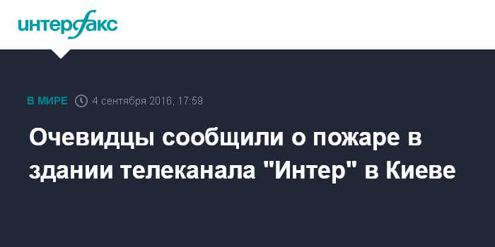 Москва. 4 сентября. INTERFAX.RU - Пожар начался в здании телеканала "Интер", расположенном на улице Щусева в Киеве, сообщают очевидцы в соцсетях в воскресенье.