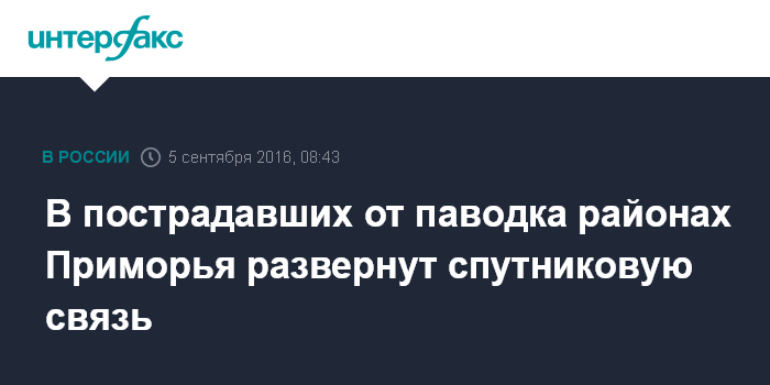 Москва. 5 сентября. INTERFAX.RU - Спутниковой связью обеспечат пострадавшие от паводка территории Приморья, где без связи остаются 19 населенных пунктов в пяти районах края и одном городском округе.