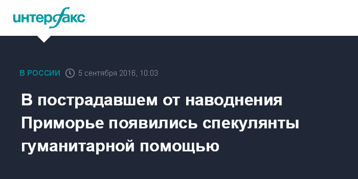 Москва. 5 сентября. INTERFAX.RU - В пострадавшем от наводнении Приморском крае зафиксированы попытки продажи гуманитарной помощи - вещей и продуктов, собранных для местных жителей.