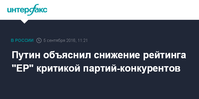 Москва. 5 сентября. INTERFAX.RU - Президент РФ Владимир Путин признал, что в преддверии выборов в Госдуму рейтинг "Единой России" пошел вниз, и объяснил это критикой со стороны конкурирующих партий.