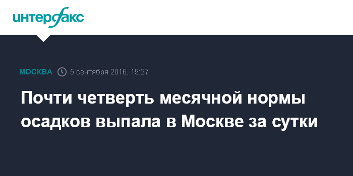 Москва. 5 сентября. INTERFAX.RU - По данным на 18:00, на базовой метеостанции на ВДНХ за вечер воскресенья и в течение понедельника выпало 15 мм осадков, сообщили "Интерфаксу" в Гидрометеобюро Москвы и Московской области.