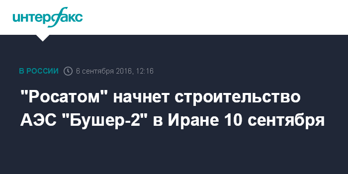 Москва. 6 сентября. INTERFAX.RU - ГК "Росатом" планирует 10 сентября закладку первого камня в строительство АЭС "Бушер-2" в Иране, сообщает группа компаний ASE.