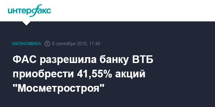 Москва. 6 сентября. INTERFAX.RU - Федеральная антимонопольная служба (ФАС) РФ разрешила ВТБ (MOEX: VTBR) приобрести 41,55% акций АО "Московский метрострой" ("Мосметрострой"), говорится в сообщении ФАС.