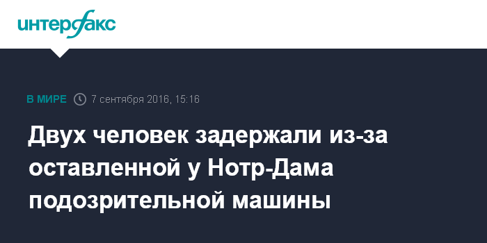 Москва. 7 сентября. INTERFAX.RU - Два человека взяты под стражу во Франции после обнаружения в ночь воскресенье подозрительного автомобиля в самом центре французской столицы, близ собора Нотр-Дам, сообщают в среду французские СМИ.