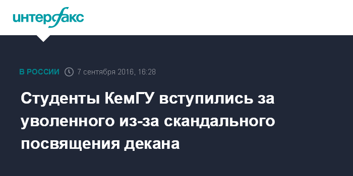Москва. 7 сентября. INTERFAX.RU - Студенты Кемеровского государственного университета, первокурсники которого были сфотографированы обнаженными во время посвящения, запустили хэштег в поддержку уволенного из-за этого скандала декана исторического факультета Константина Юматова.