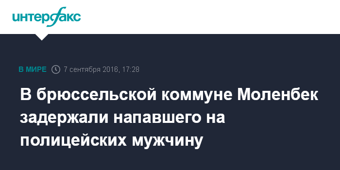 Москва. 7 сентября. INTERFAX.RU - На двоих полицейских, патрулировавших в Брюсселе парк в коммуне Моленбек, во второй половине дня в среду напал человек с ножом.