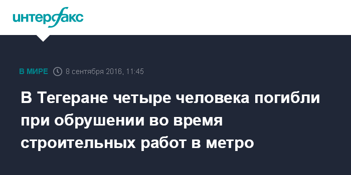 Москва. 8 сентября. INTERFAX.RU - По меньшей мере четыре человека погибли в Тегеране во время обрушения бетонных секций, соединяющих строящуюся станцию метро и тоннель, сообщают в четверг местные СМИ.