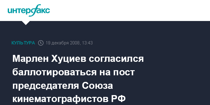 Москва. 19 декабря. INTERFAX.RU - Кинорежиссер Марлен Хуциев согласился баллотироваться на пост председателя Союза кинематографистов России - он единственный кандидат.