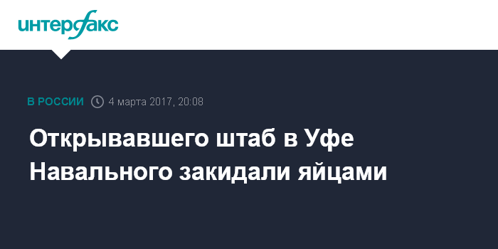 Москва. 4 марта . INTERFAX.RU - Оппозиционер Алексей Навальный открыл избирательный штаб в Уфе. Его самого и его соратников закидали яйцами на железнодорожном вокзале города.