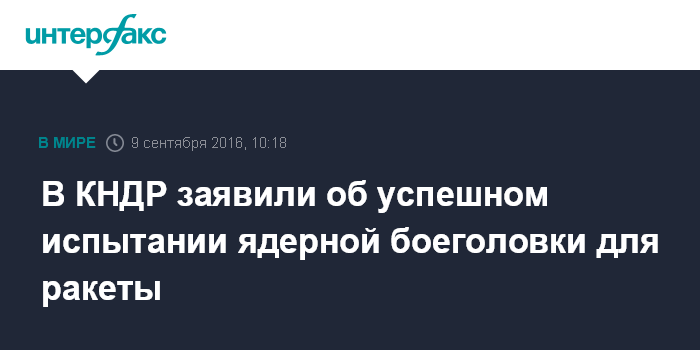 Москва. 9 сентября. INTERFAX.RU - Проведенное в КНДР ядерное испытание оказалось успешным и позволит стандартизировать производимые ядерные боеголовки для установки их на ракеты типа "Хвасон", заявили в северокорейском Институте ядерного вооружения.