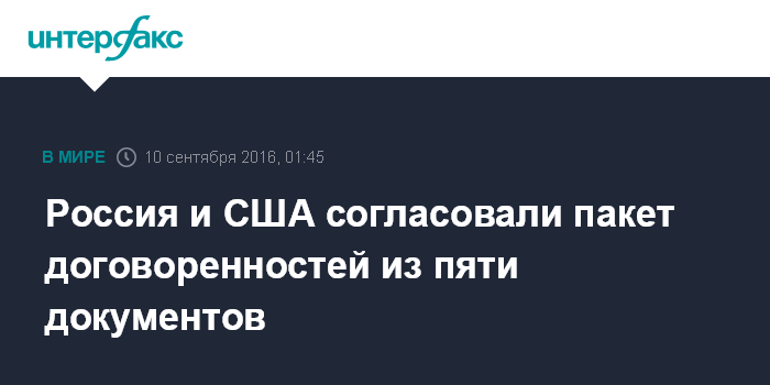 Москва. 10 сентября. INTERFAX.RU - Россия и США согласовали в пятницу в Женеве пакет из пяти документов по стабилизации ситуации в Сирии, заявил глава МИД РФ Сергей Лавров после переговоров с госсекретарем США Джоном Керри, которые длились свыше 14 часов.