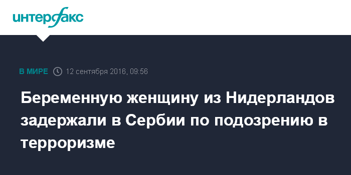 Власти Нидерландов подтвердили местному телевидению арест в Сербии молодой женщины из-за принадлежности к террористической организации. По их данным, она направлялась в Сирию.