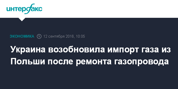 Москва. 12 сентября. INTERFAX.RU - Импорт Украиной газа из Польши, прерванный утром 9 сентября из-за разгерметизации газопровода на украинской территории, возобновлен в понедельник в 7:00, сообщил пресс-секретарь ПАО "Укртрансгаз" Максим Белявский.