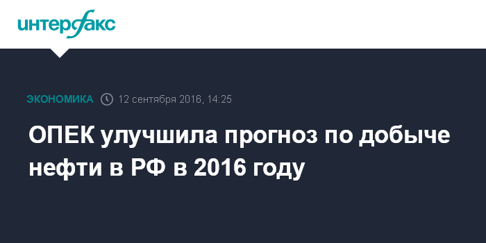 Москва. 12 сентября. INTERFAX.RU - ОПЕК улучшила прогноз по добыче нефти в России в 2016 году на 10 тыс. баррелей в сутки (б/с) - до 10,99 млн б/с, говорится в ежемесячном обзоре картеля.