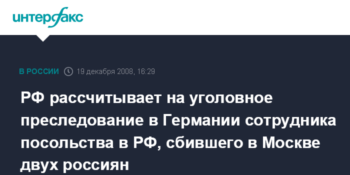 Москва. 19 декабря. INTERFAX.RU - В МИД России послу ФРГ в РФ Вальтеру Юргену Шмиду было сделано официальное представление в связи с недавним ДТП в Москве с участием члена административно-технического персонала посольства ФРГ Томаса Хоберта, повлекшим гибель двух граждан России. Инцидент произошел в ночь на 30 ноября 2008 года.