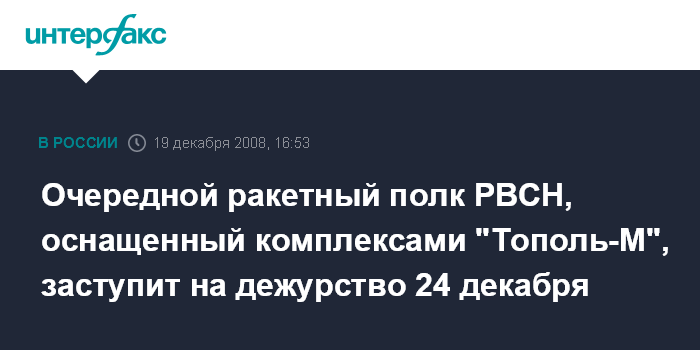 Москва. 19 декабря. INTERFAX.RU - Ракетный полк, вооруженный подвижными грунтовыми ракетными комплексами "Тополь-М", заступит на боевое дежурство в Тейковской дивизии (Ивановская область) 24 декабря, сообщили "Интерфаксу-АВН" в пятницу в службе информации Ракетных войск стратегического назначения (РВСН).