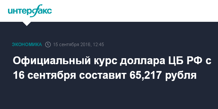Официальный курс доллара ЦБ РФ с 16 сентября составит 65,217 рубля