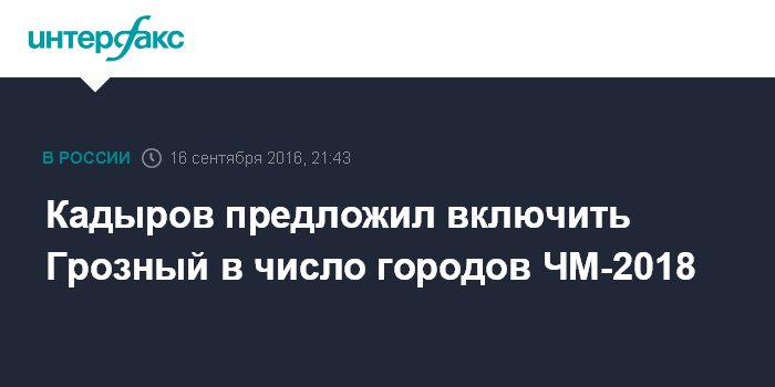 Москва. 16 сентября. INTERFAX.RU - И.о.главы Чечни Рамзан Кадыров заявил, что Грозный заслуживает проведения матча или матчей чемпионата мира по футболу в 2018 году.