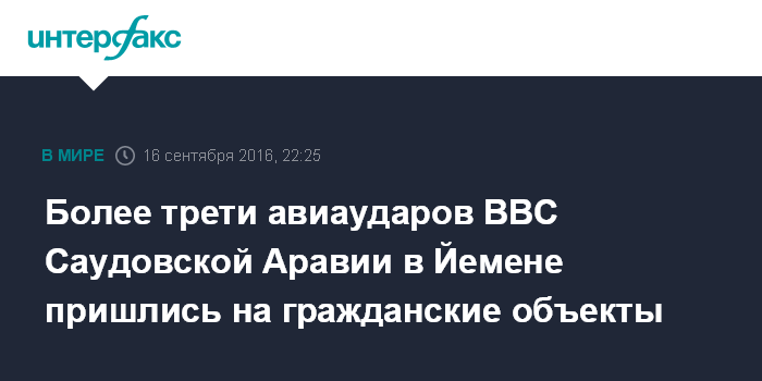 Москва. 16 сентября. INTERFAX.RU - Целью более трети авиаударов, осуществляемых ВВС Саудовской Аравии в Йемене, являются гражданские объекты, сообщила в пятницу британская газета The Guardian со ссылкой на исследование группы экспертов.