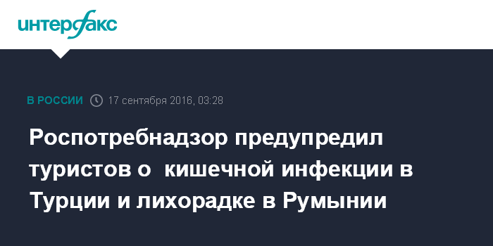 Москва. 17 сентября. INTERFAX.RU - Роспотребнадзор обращает внимание российских туристов, планирующих отдых за рубежом, на ухудшение санитарно-эпидемиологической обстановки в Турции и о случаях заболевания лихорадкой Западного Нила в Румынии.