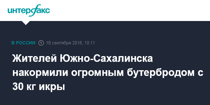 Москва. 18 сентября. INTERFAX.RU - Огромный бутерброд с 30 кг лососевой икры съели сегодня жители и гости Южно-Сахалинска на фестивале "Остров-рыба", который второй год подряд проходит в областном центре.