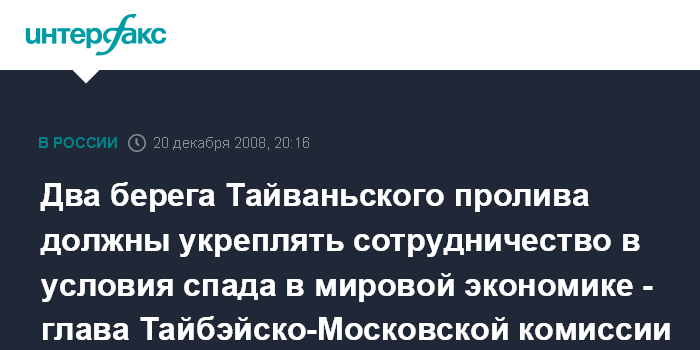 "В сфере экономики стороны имеют очень тесные отношения. В условиях мирового экономического спада два берега Тайваньского пролива должны укреплять сотрудничество, объединять усилия в противодействии кризису", -сказал он в интервью агентству "Интерфакс".